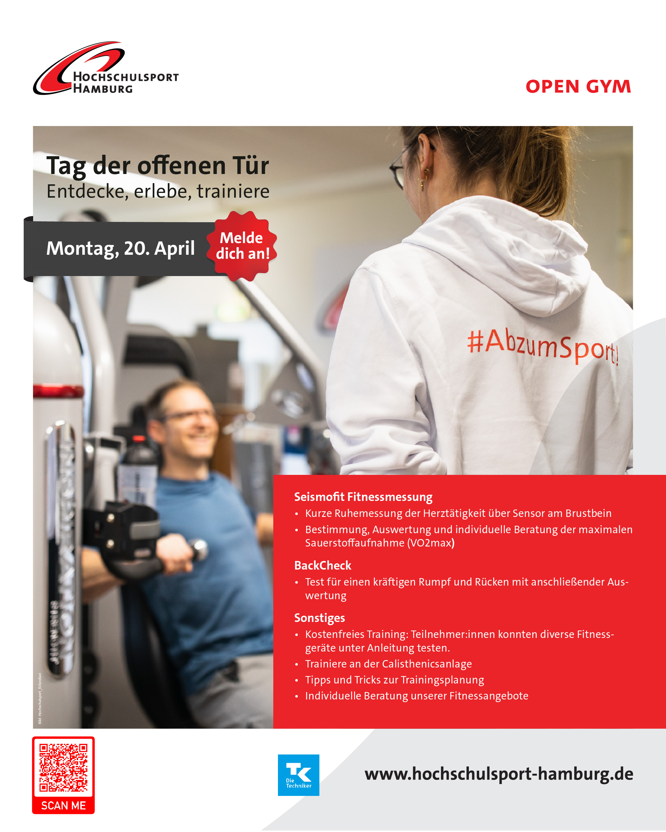 Kursbuchung Tag der offenen Tür im UNI-Studioverantwortlich: Jan Rosenthal Am Montag, den 20. April findet im Uni-Studio der Tag der offenen Tür statt. Melde dich kostenfrei an, komm vorbei. Du kannst dich umfangreich informieren, Fitnessgeräte testen und an Aktionen in Zusammenarbeit mit der TK teilnehmen. Kostenfreies Training an diesem Tag für alle mit Sportsachen möglich Seismofit VO2max-Fitnessmessung (Bestimmung, Auswertung und indiv. Beratung der maximalen Sauerstoffaufnahme (VO2max) Tipps und Tricks zur Trainingsplanung Nutze den Back-Check mit Auswertung (Kraftmessung für Rumpf und Rücken) Trainiere an der Calisthenicsanlage Individuelle Beratung unserer Fitnessangebote Nr.No.DetailsDetailTag / Zeit / OrtDay / Time / LocationZeitraumDurationLeitungGuidancePreisCostBuchungBooking411111Tag der offenen Tür im UNI-Studio 411111Tag der offenen Tür im UNI-Studio 20.04.2026Mo12:00-20:00Studio UNI20.04.entgeltfreientgeltfrei / free of charge