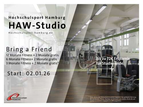 Kursbuchung FitnessCard Bring a Friend - HAW-Studioverantwortlich: Robert Konopka Starte aktiv ins neue Jahr - gemeinsam mit Freund*innen Der Hochschulsport schenkt dir und einer Freundin /einem Freund bei Buchung eurer FitnessCard im Aktionszeitraum (02.01.-31.01.2026) jeweils zwei kostenlose Zusatz-Monate. Auch wenn du die FitnessCard schon hast, kannst du von der Anmeldung einer befreundeten Person profitieren. Wichtig ist, dass die werbende Person bei der Buchung angegeben wird. Nur gültig bei Nennung der werbenden Person. Nutzbar während unserer angegebenen Öffnungszeiten. Die angegebenen Entgelte stehen in dieser Reihenfolge für: Studierende / Beschäftigte / GästeKursnrNo.DetailsDetailTagDayZeitTimeOrtLocationZeitraumDurationLeitungGuidancePreisCostBuchungBooking4311035 Monate für 3 Ratenalle 3 Studios108/ 135/ 192 €108 EURfür Studierende135 EURfür Beschäftigte192 EURfür Gästeab 01.01., 00:014311068 Monate für 6 Ratenalle 3 Studios180/ 234/ 336 €180 EURfür Studierende234 EURfür Beschäftigte336 EURfür Gästeab 01.01., 00:0143111214 Monate für 12 Ratenalle 3 Studios300/ 396/ 576 €300 EURfür Studierende396 EURfür Beschäftigte576 EURfür Gästeab 01.01., 00:01Trage dich hier mit deiner E-Mail-Adresse ein, um über unseren "Infoservice" mit standortspezifischen Informationen zum HAW-Studio versorgt zu werden!KursnrNo.DetailsDetailTagDayZeitTimeOrtLocationZeitraumDurationLeitungGuidancePreisCostBuchungBooking431125Info-Service01.10.-31.03.entgeltfrei