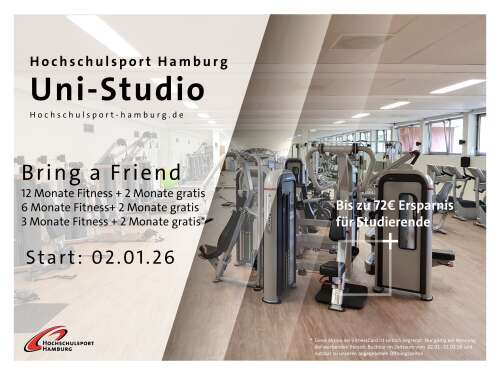 Kursbuchung FitnessCard Bring a Friend - UNI-Studioverantwortlich: Jan Rosenthal Starte aktiv ins neue Jahr - gemeinsam mit Freund*innen Der Hochschulsport schenkt dir und einer Freundin /einem Freund bei Buchung eurer FitnessCard im Aktionszeitraum (02.01.-31.01.2026) jeweils zwei kostenlose Zusatz-Monate. Auch wenn du die FitnessCard schon hast, kannst du von der Anmeldung einer befreundeten Person profitieren. Wichtig ist, dass die werbende Person bei der Buchung angegeben wird. Nur gültig bei Nennung der werbenden Person. Nutzbar während unserer angegebenen Öffnungszeiten. Die angegebenen Entgelte stehen in dieser Reihenfolge für: Studierende / Beschäftigte / GästeKursnrNo.DetailsDetailTagDayZeitTimeOrtLocationZeitraumDurationLeitungGuidancePreisCostBuchungBooking4111035 Monate für 3 Ratenalle 3 Studios108/ 135/ 192 €108 EURfür Studierende135 EURfür Beschäftigte192 EURfür Gästeab 01.01., 00:014111068 Monate für 6 Ratenalle 3 Studios180/ 234/ 336 €180 EURfür Studierende234 EURfür Beschäftigte336 EURfür Gästeab 01.01., 00:0141111214 Monate für 12 Ratenalle 3 Studios300/ 396/ 576 €300 EURfür Studierende396 EURfür Beschäftigte576 EURfür Gästeab 01.01., 00:01Trage dich hier mit deiner E-Mail-Adresse ein, um über unseren "Infoservice" mit standortspezifischen Informationen zum UNI-Studio versorgt zu werden!KursnrNo.DetailsDetailTagDayZeitTimeOrtLocationZeitraumDurationLeitungGuidancePreisCostBuchungBooking411125Info-Service01.10.-31.03.entgeltfrei